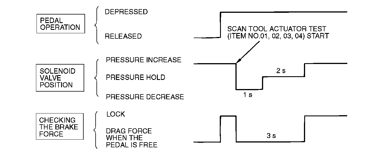 11. Turn the wheel by hand and check the change in braking force when the brake pedal is depressed. When using the braking force tester, depress the brake pedal until the braking force is at the following values, and check that the braking force changes to the brake drag force inspected in step 2 when the actuator is force-driven. The result should be as shown in the diagram above.