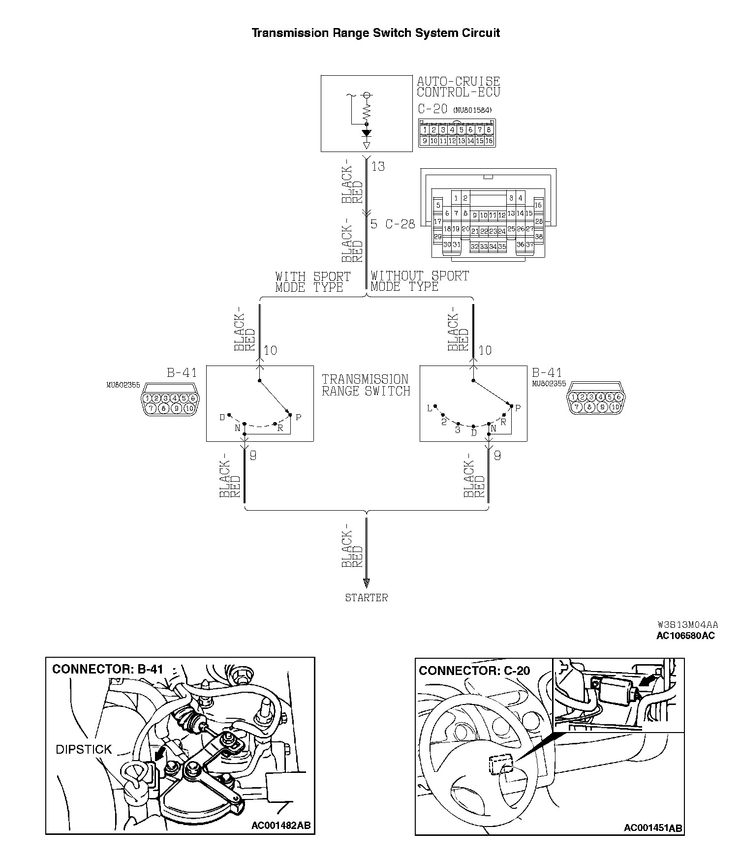 STEP 7. Check the harness wire between transmission range switch connector B-41 (terminal number 10) and auto-cruise control-ECU connector C-20 (terminal number 13).