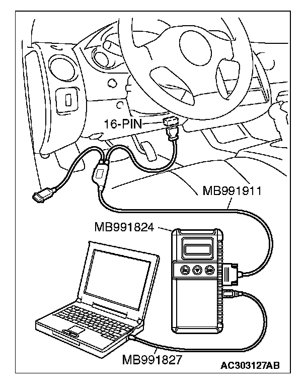CAUTION: To prevent damage to scan tool MB991958, always turn the ignition switch to the "LOCK" (OFF) position before connecting or disconnecting scan tool MB991958.