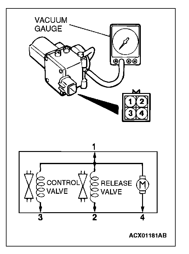 - Connect the positive battery terminal to auto-cruise vacuum pump connector terminal 1 and the negative battery terminal to terminals 2, 3 and 4. Then the vacuum gauge should read 27 kPa (8.0 in.Hg) or more.