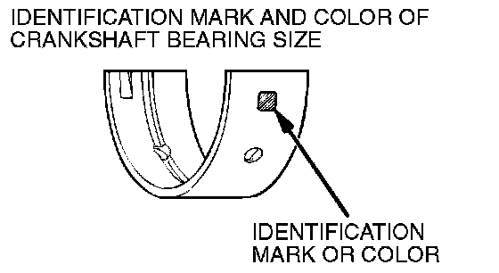 For example, if the crankshaft journal outside diameter identification mark is "0" or identification color is "Yellow" and cylinder block bearing bore identification mark is "1," select a bearing whose identification mark is "2" or identification color is "Yellow" for number 1, 2, 4 and 5, and a bearing whose identification mark is "1" or identification color is "Green" for number 3. If there is no identification color paint or no identification mark on the crankshaft, measure the journal outside diameter and select a bearing appropriate for the measured value.