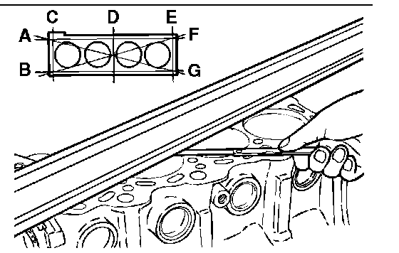 2. Using a straightedge and feeler gauge, check the block top surface for war page. Make sure that the surface is free from gasket chips and other foreign matter.