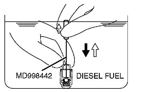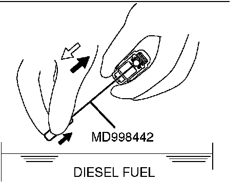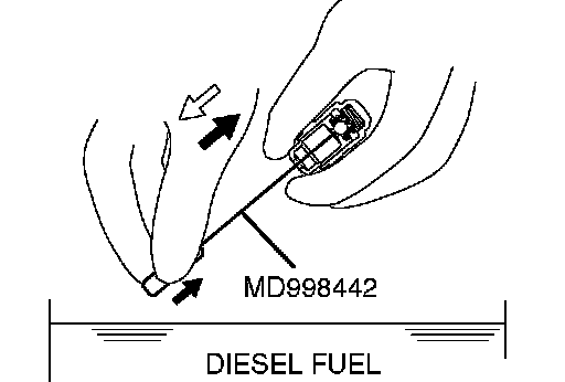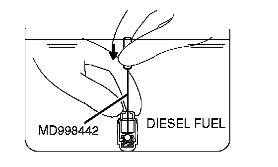 3. While gently pushing down the internal steel ball using wire [0.5 mm (0.020 inch) in diameter] or special tool MD998442, move the plunger through five to ten strokes until it slides smoothly. In addition to eliminating stiffness in the plunger, this operation will remove dirty oil.