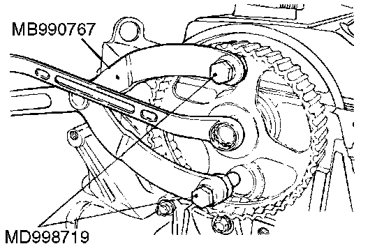 1. While holding the camshaft sprocket with special tools MB990767 and MD998719, loosen the camshaft sprocket bolt.