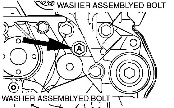 3. Make sure that the relationship between the tensioner pulley center and the bolt center is as shown in the illustration.