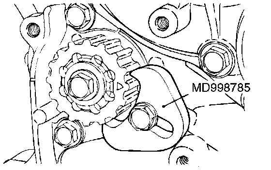 1. Set special tool MD998785 as shown to prevent the counterbalance shaft sprocket from turning together.