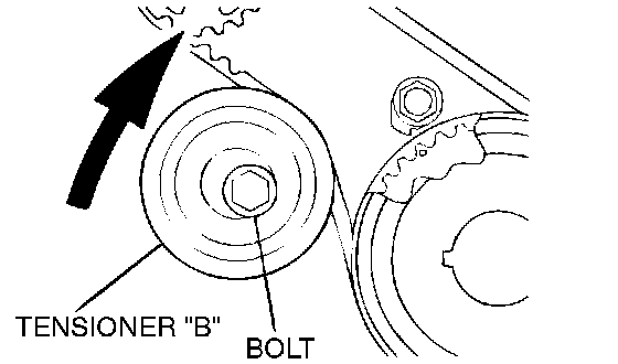 2. Loosen the tensioner "B" bolt, and then remove the timing belt "B."