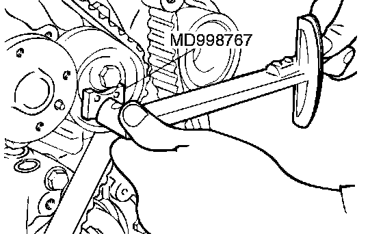 13. Holding the tensioner pulley with special tool MD998767 and torque wrench, tighten the center bolt to specification.