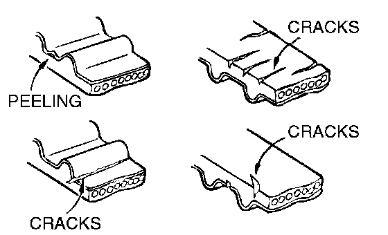 6. Abnormal wear of belt sides. Normal wear is indicated if the sides are sharp as if cut by a knife. Abnormal wear is indicated if the sides are ragged.