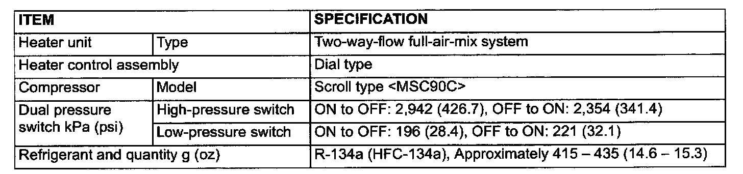 GENERAL INFORMATIONThe heater system uses a two-way-flow full-air-mix system that features high performance and low operating noise. It includes an independent face air blowing function.