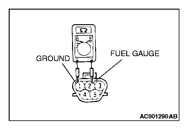 1. Check that resistance value between the fuel gauge terminal and ground terminal is at the standard value when the fuel level sensor float is between point "F" (highest) and point "E" (lowest).