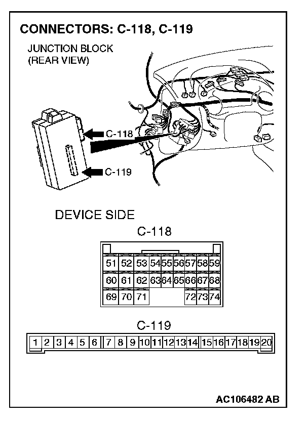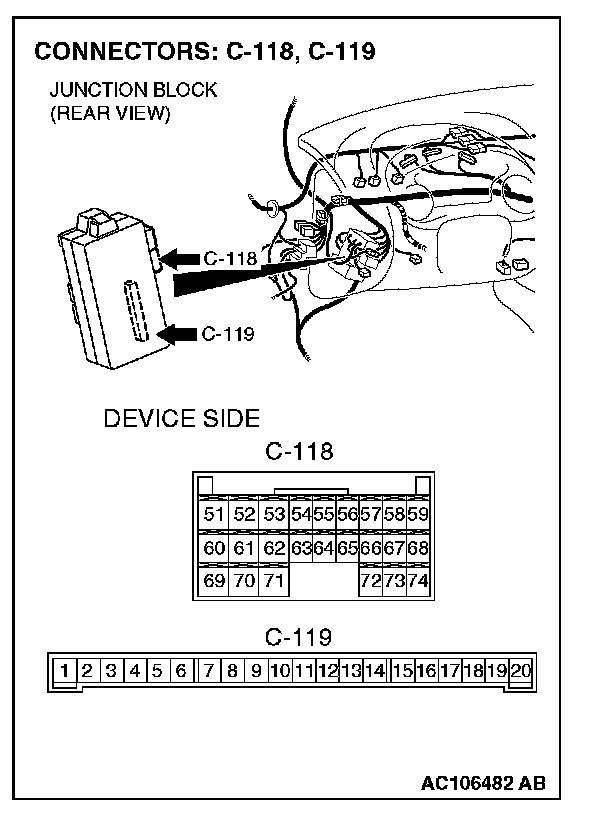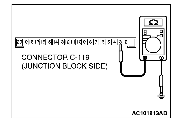 1. Disconnect ETACS-ECU connector C-118, C-119, and measure the resistance available at the junction block side of the connector.