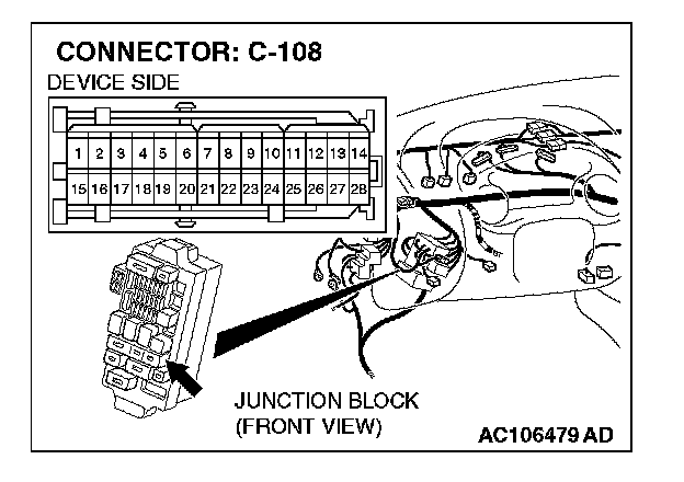 NOTE: Also check junction block connector C-108 for loose, corroded, or damaged terminals, or terminals pushed back in the connector. If junction block connector C-108 is damaged, repair or replace the damaged component(s) as described in Harness Connector Inspection.