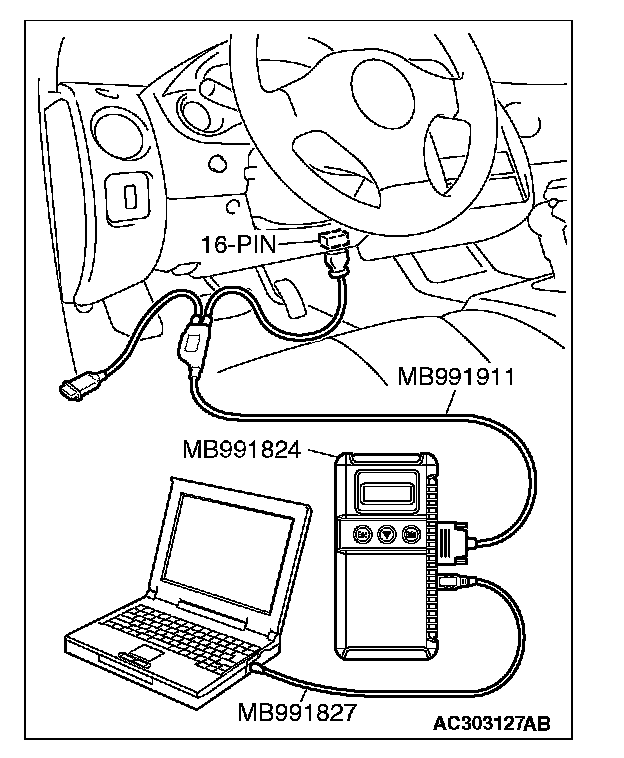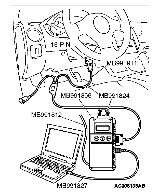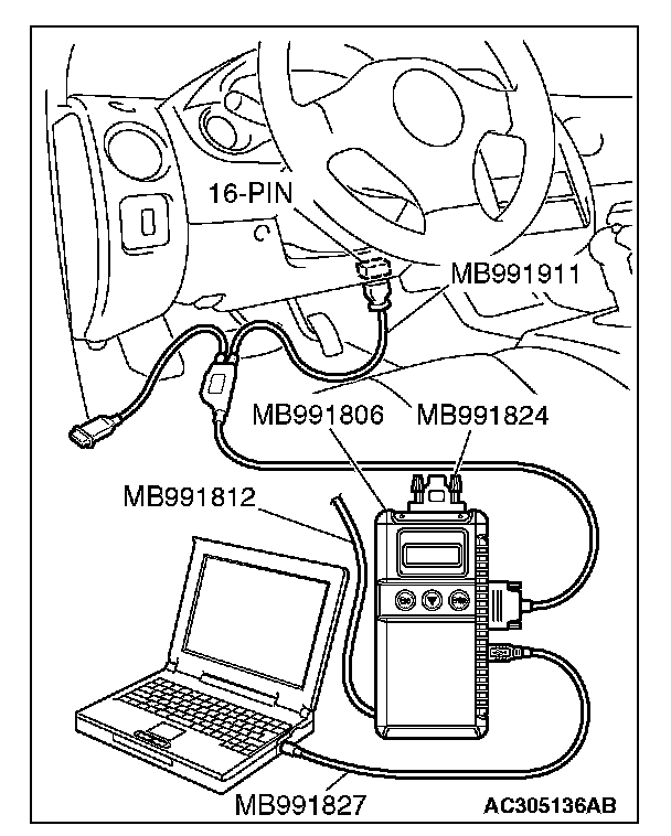 CAUTION: To prevent damage to scan tool MB991958, always turn the ignition switch to the "LOCK" (OFF) position before connecting or disconnecting scan tool MB991958. Connect special tool MB991910 before connecting special tool MB991812. Be sure to connect special tool MB991806 after turning on special tool MB991824.