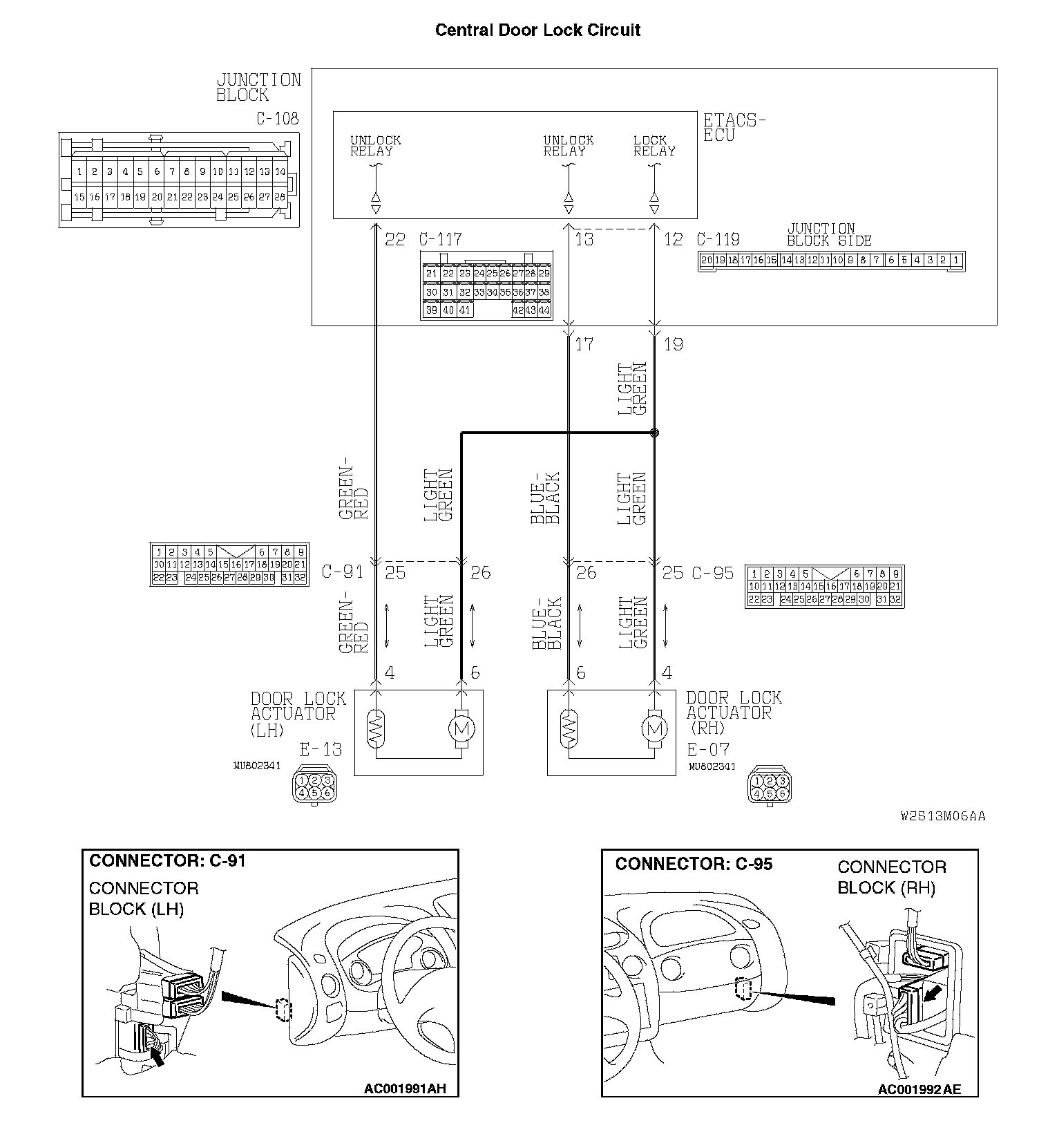 STEP 5. Check the wiring harness from ETACS-ECU connectors C-117 (terminal 22) and C-119 (terminal 12) to driver's door lock actuator connector E-13 (terminals 4 and 6).