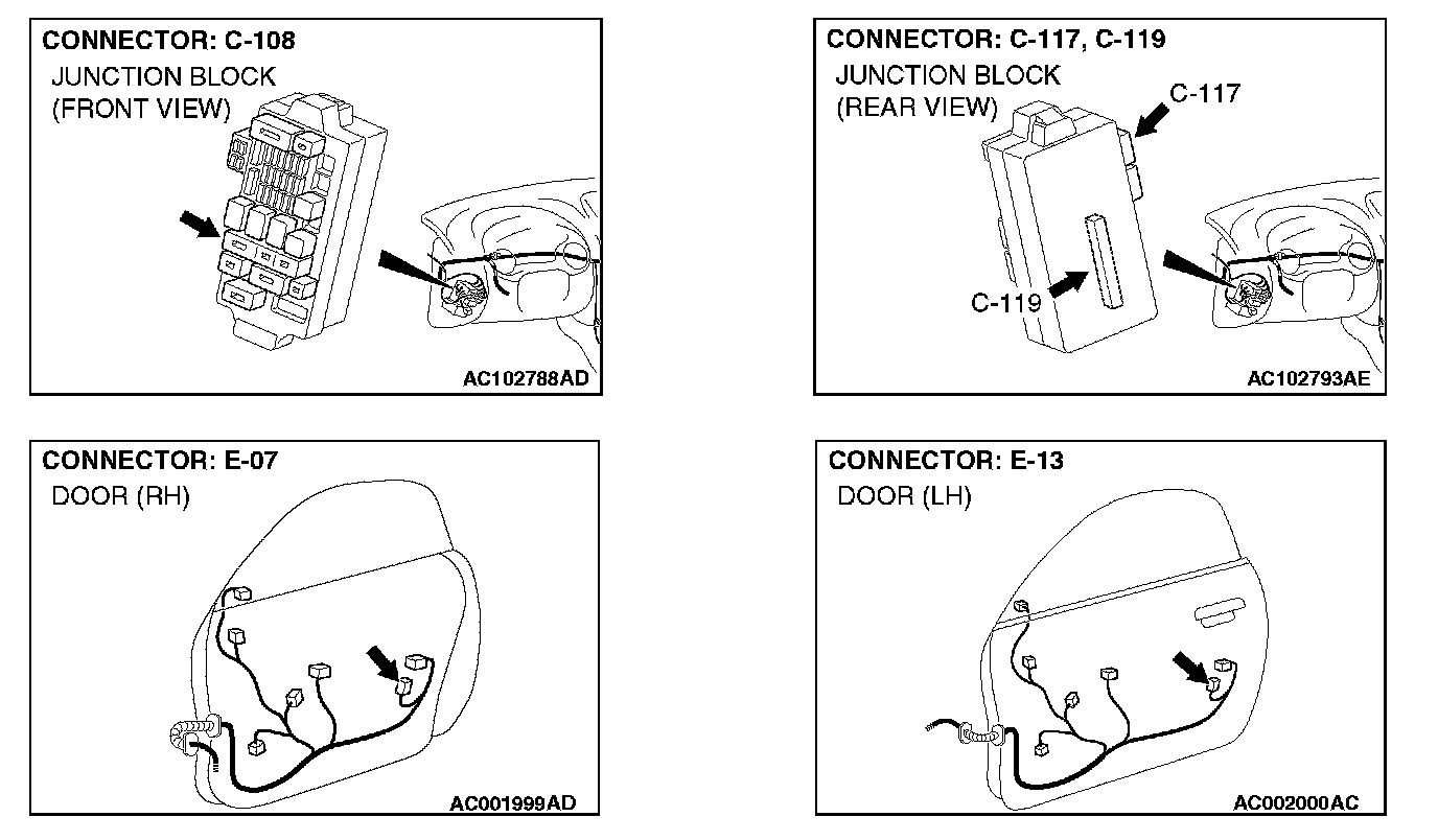 STEP 9. Check the wiring harness from ETACS-ECU connector C-119 (terminals 12 and 13) to front passenger's door lock actuator connector E-07 (terminals 4 and 6).