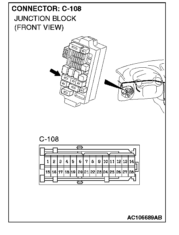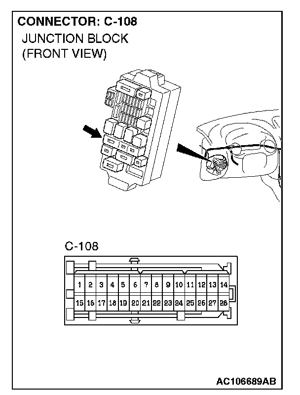 NOTE: Also check junction block connector C-108 and intermediate connector C-91. If junction block connector C-108 or intermediate connector C-91 is damaged, repair or replace the damaged component(s) as described in Harness Connector Inspection.
