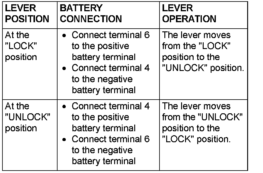 2. Follow the table to check the driver's door lock actuator for correct operation.