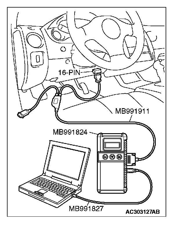 CAUTION: To prevent damage to scan tool MB991958, always turn the ignition switch to the "LOCK" (OFF) position before connecting or disconnecting scan tool MB991958.