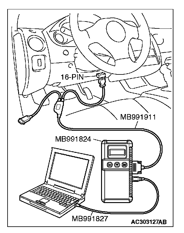 CAUTION: To prevent damage to scan tool MB991958, always turn the ignition switch to the "LOCK" (OFF) position before connecting or disconnecting scan tool MB991958. Connect special tool MB991910 before connecting special tool MB991812. Be sure to connect special tool MB991806 after turning on special tool MB991824.