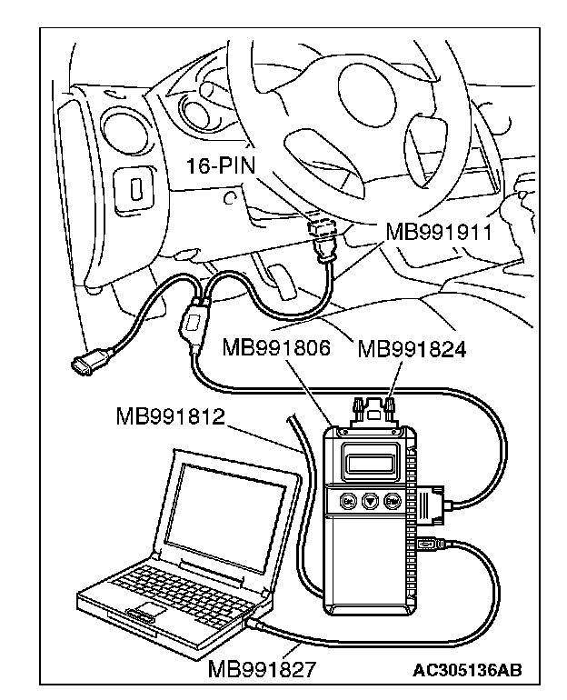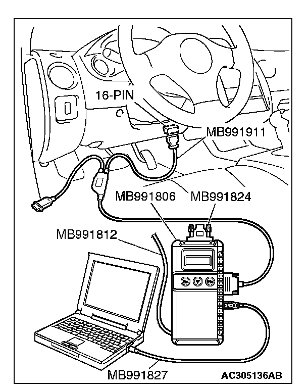 CAUTION: To prevent damage to scan tool MB991958, always turn the ignition switch to the "LOCK" (OFF) position before connecting or disconnecting scan tool MB991958. Connect special tool MB991910 before connecting special tool MB991812. Be sure to connect special tool MB991806 after turning on special tool MB991824.