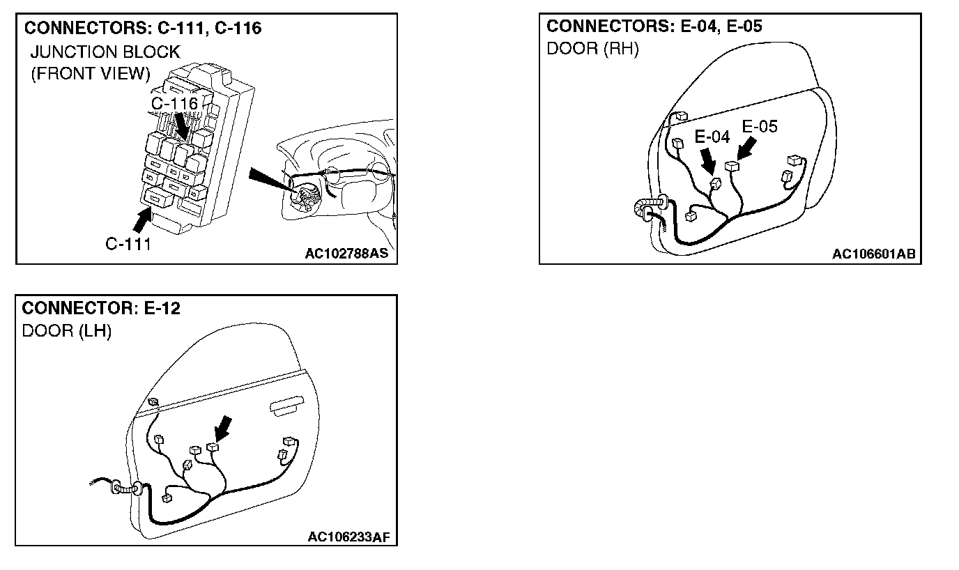 STEP 9. Check the wiring harness between power window relay connector C-116 (terminal 4) and power window sub switch connector E-05 (terminal 7).