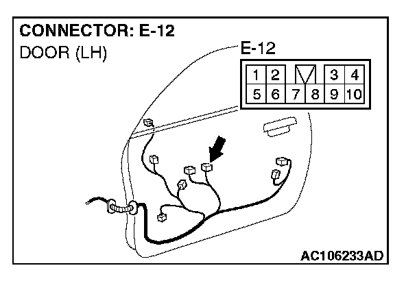 STEP 1. Check power window main switch connector E-12 for loose, corroded or damaged terminals, or terminals pushed back in the connector.