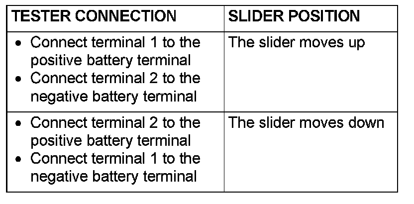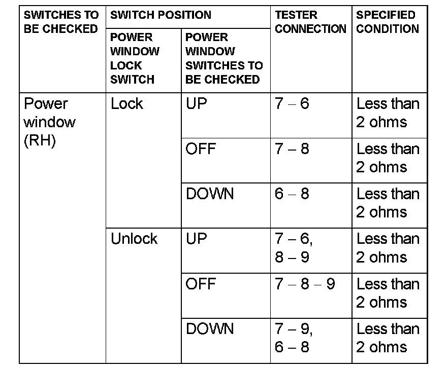 2. Follow the table below to check the front power window motor (RH) for correct operation.