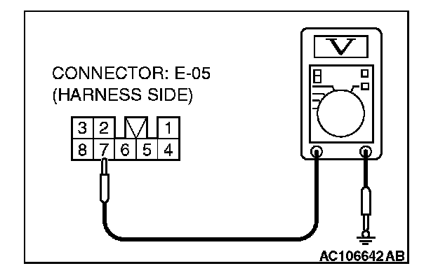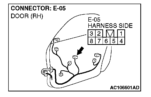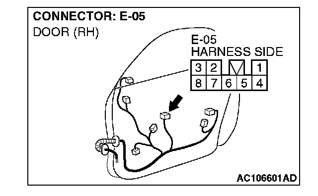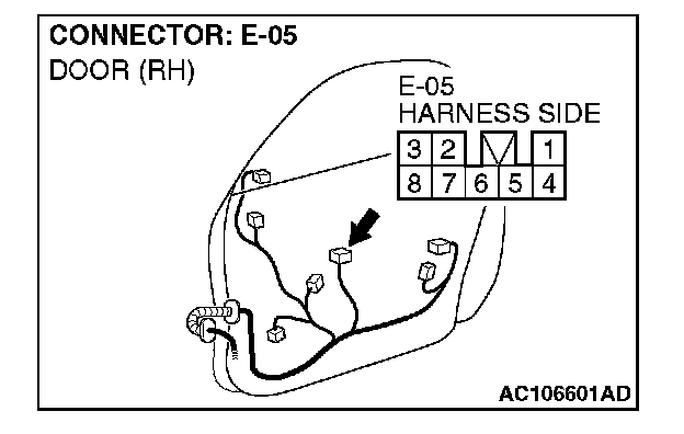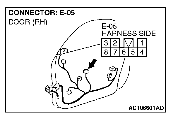 1. Disconnect power window sub-switch (front: RH) connector E-05 and measure the voltage available at the wiring harness side of the connector.
