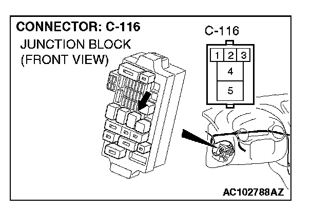 STEP 8. Check power window relay connector C-116 for loose, corroded or damaged terminals, or terminals pushed back in the connector.
