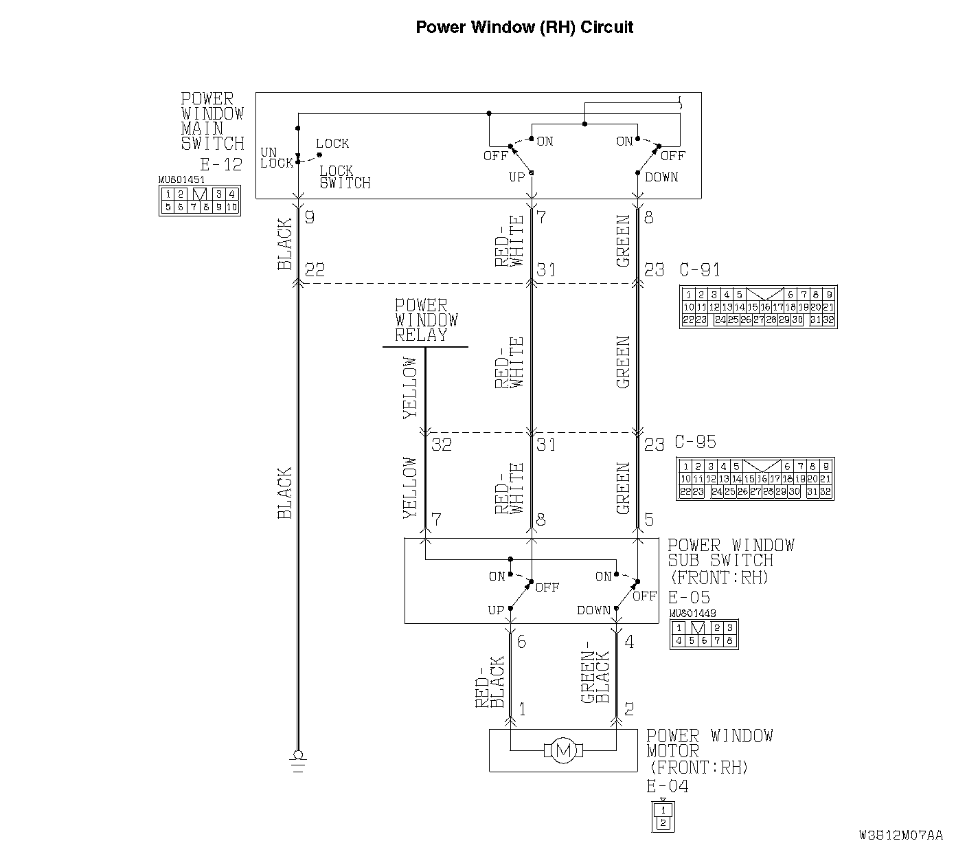 Power Window: Power Window (RH) does not Work by Operating Power Window Main Switch.Power Window (RH) Circuit: