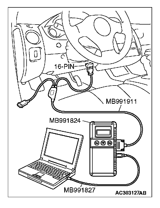 CAUTION: To prevent damage to scan tool MB991958, always turn the ignition switch to the "LOCK" (OFF) position before connecting or disconnecting scan tool MB991958.