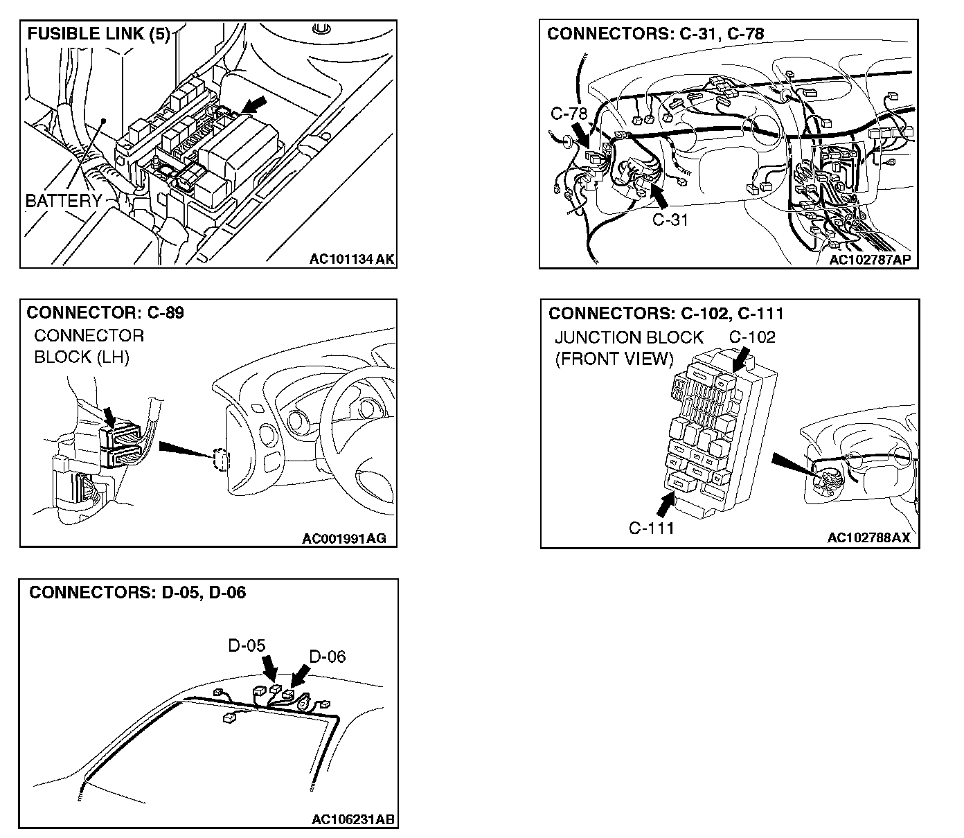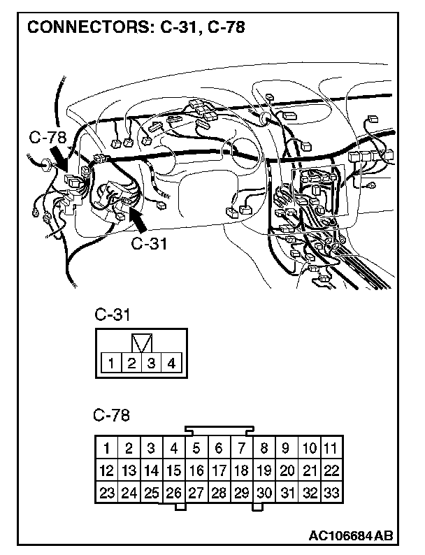 NOTE: Also check intermediate connectors C-31, C-89 and joint connector C-78 for loose, corroded, or damaged terminals, or terminals pushed back in the connector, check the wires. If intermediate connectors C-31, C-89 or joint connector C-78 are damaged, Repair or replace the damaged component(s) as described in Harness Connector Inspection.