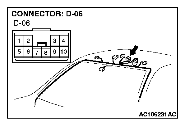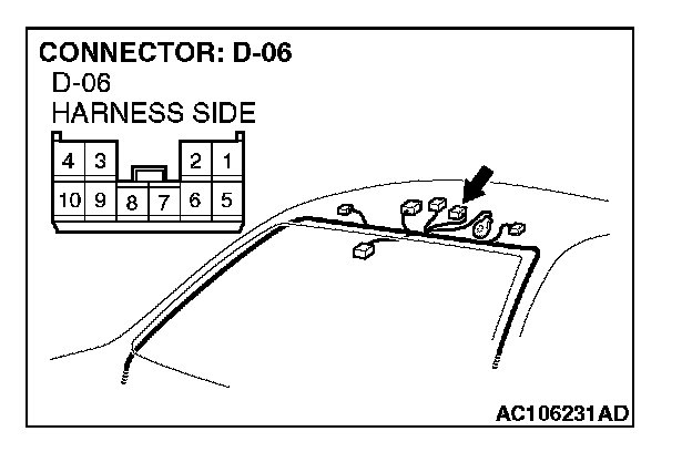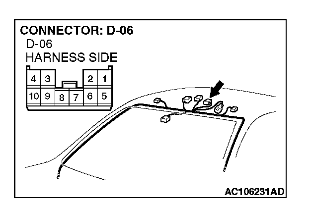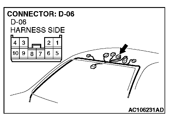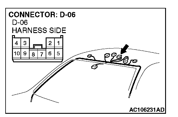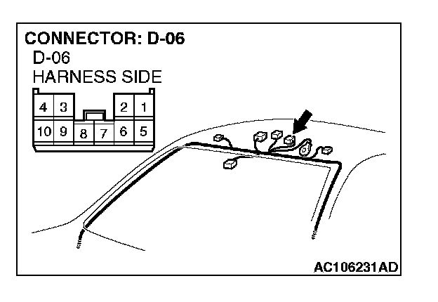 STEP 1. Check the sunroof motor assembly connector D-06 for loose, corroded or damaged terminals, or terminals pushed back in the connector.