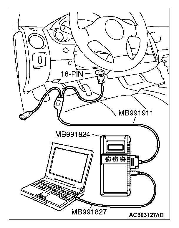 CAUTION: To prevent damage to scan tool MB991958, always turn the ignition switch to the "LOCK" (OFF) position before connecting or disconnecting scan tool MB991958.