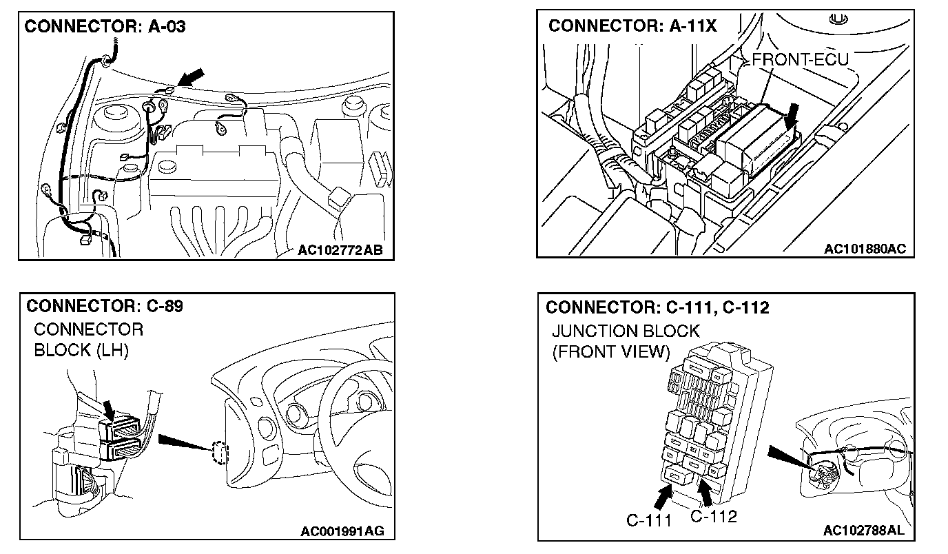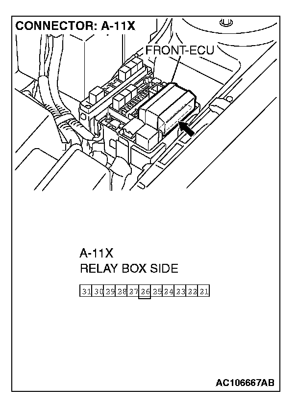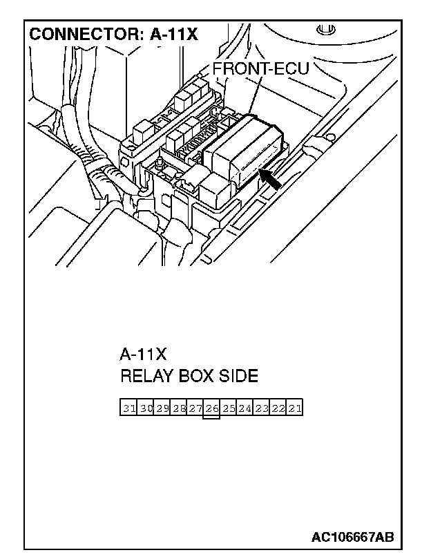 STEP 7. Check the front-ECU connector A-11X for loose, corroded or damaged terminals, or terminals pushed back in the connector.