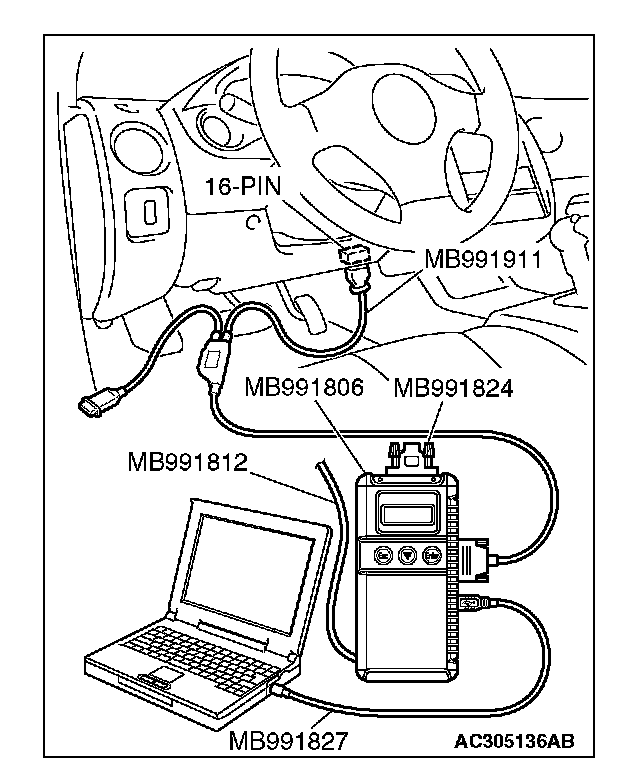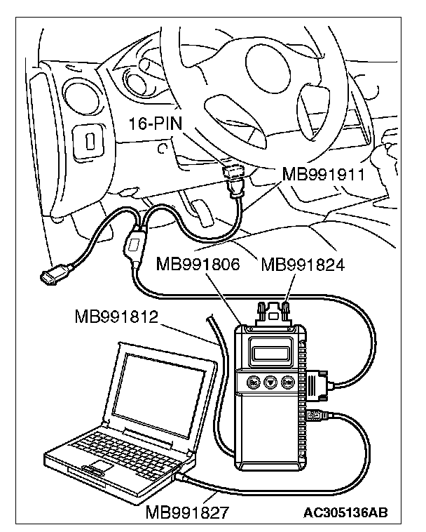 CAUTION: To prevent damage to scan tool MB991958, always turn the ignition switch to the "LOCK" (OFF) position before connecting or disconnecting scan tool MB991958. Connect special tool MB991910 before connecting special tool MB991812. Be sure to connect special tool MB991806 after turning on special tool MB991824.