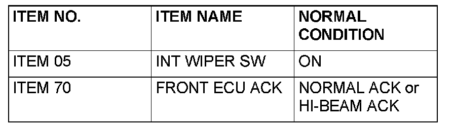 Normal condition is not displayed for the "FRONT ECU ACK": Replace the front-ECU. Verify that the windshield wiper works normally.