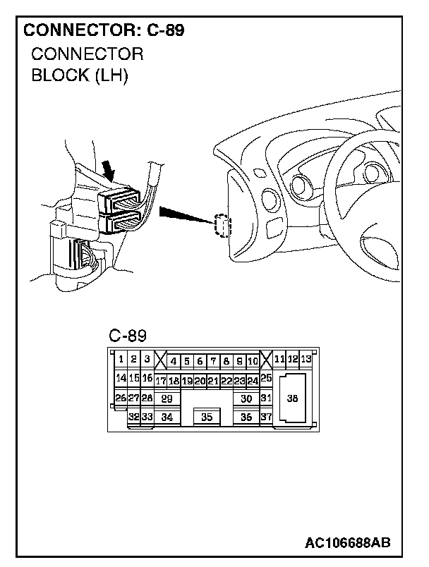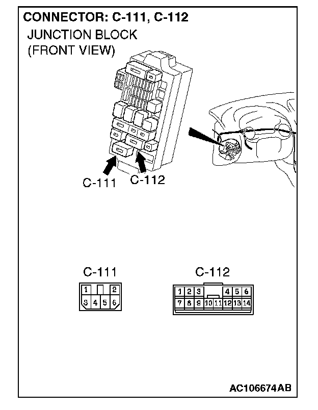 NOTE: Also check intermediate connector C-89, junction block connectors C-111 and C-112 and joint connector C-101 for loose, corroded, or damaged terminals, or terminals pushed back in the connector. If intermediate connector C-89, junction block connector C-111 or C-112 or joint connector C-101 is damaged, repair or replace the damaged component(s) as described in Harness Connector Inspection.
