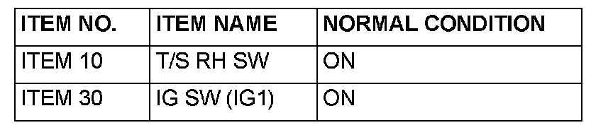 Normal condition is not displayed for "T/S RH SW": Refer to Inspection Procedure O-7 "ETACS-ECU does not receive any signal from the taillight switch, the headlight switch, the passing light switch, the dimmer switch, the turn-signal light switch or switch."