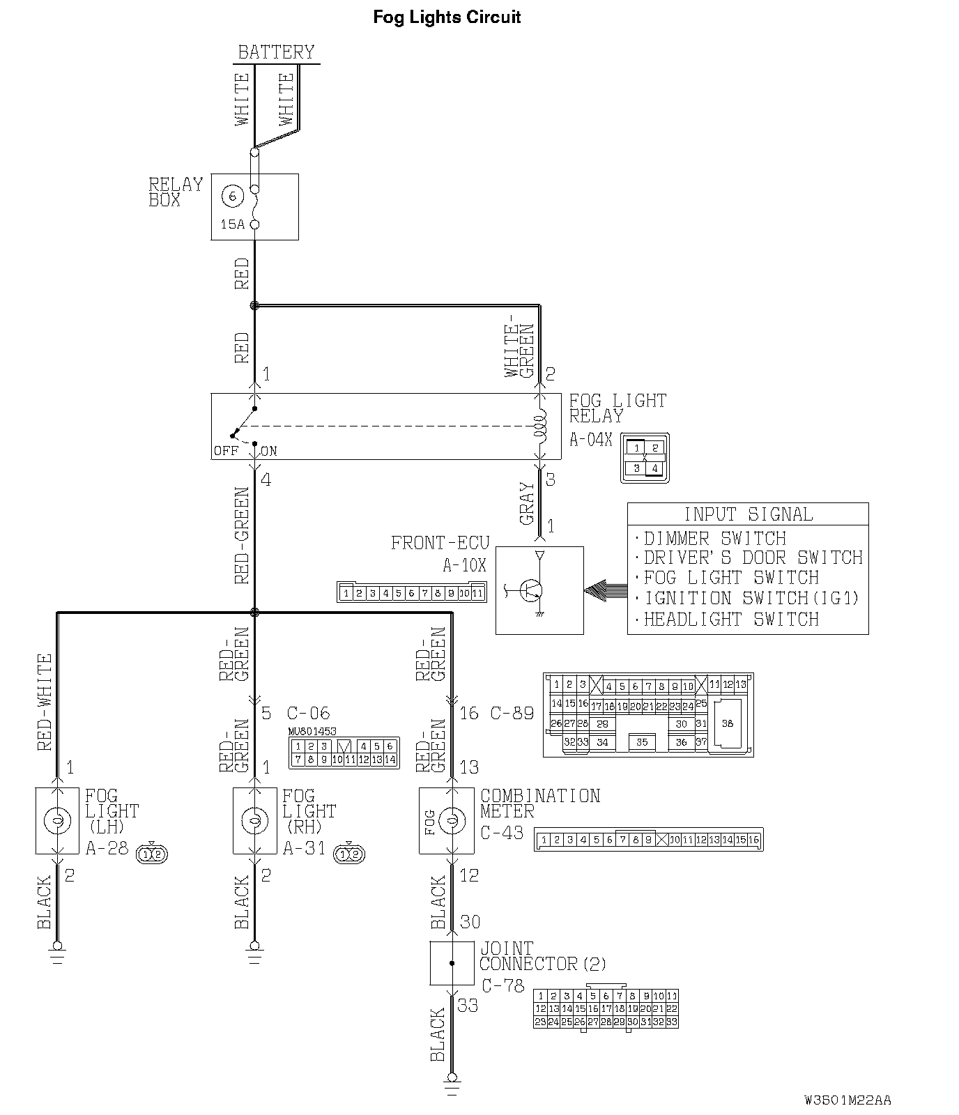 STEP 10. Check the wiring harnesses among fog light relay connector A-04X (terminal 4), fog light connectors A-28 (terminal 1), A-31 (terminal 1) and combination meter connector C-43 (terminal 13).