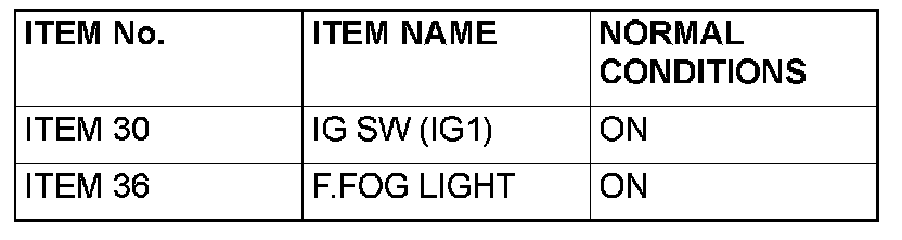 Normal condition is not displayed for "F.FOG LIGHT": Refer to Inspection Procedure O-3 "ETACS-ECU does not receive a signal from the fog light switch."