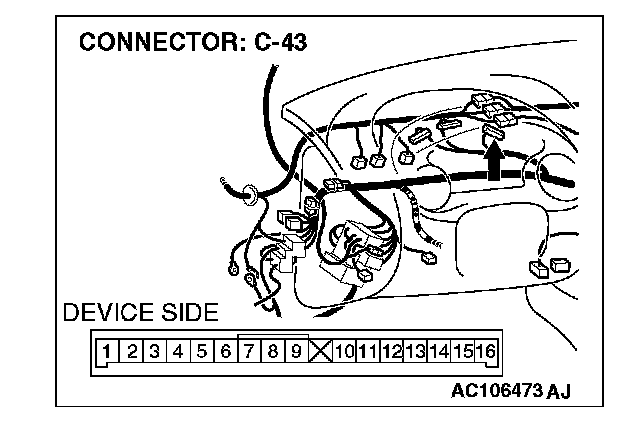 STEP 9. Check fog light connectors A-28, A-31 and combination meter connector C-43 for loose, corroded or damaged terminals, or terminals pushed back in the connector.