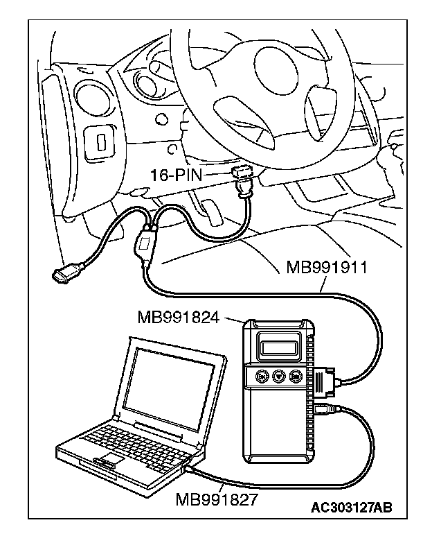 CAUTION: To prevent damage to scan tool MB991958, always turn the ignition switch to the "LOCK" (OFF) position before connecting or disconnecting scan tool MB991958.