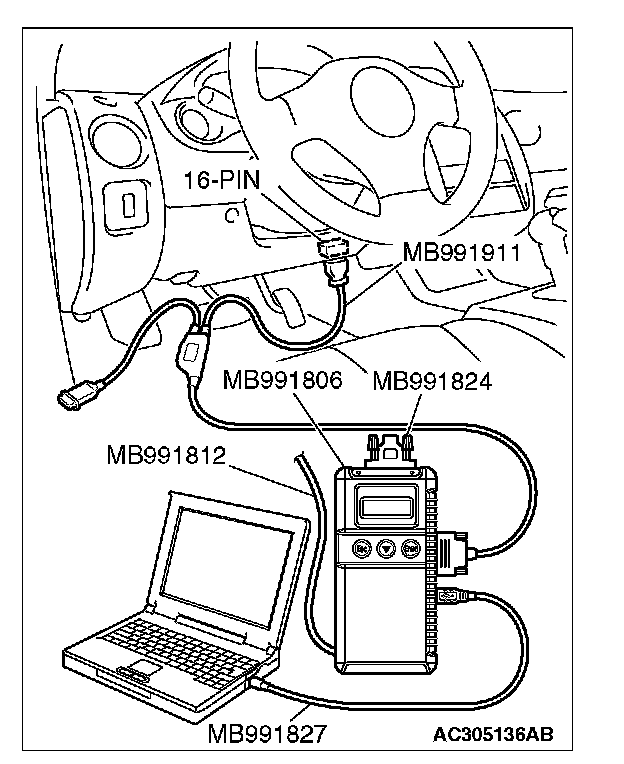 CAUTION: To prevent damage to scan tool MB991958, always turn the ignition switch to the "LOCK" (OFF) position before connecting or disconnecting scan tool MB991958. Connect special tool MB991910 before connecting special tool MB991812. Be sure to connect special tool MB991806 after turning on special tool MB991824.