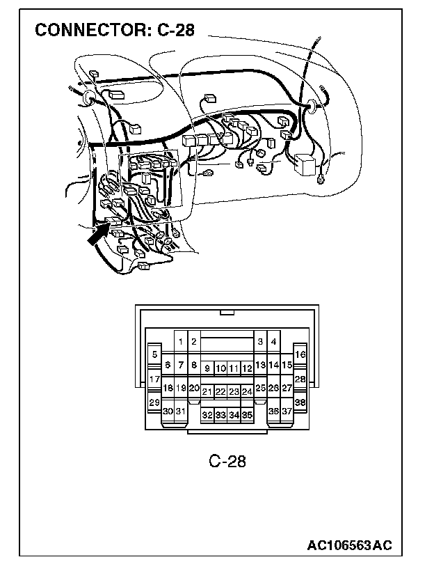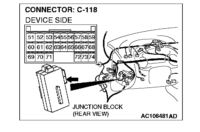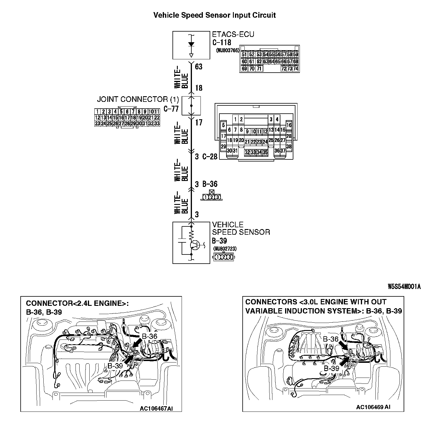 STEP 2. Check ETACS-ECU connector C-118 and vehicle speed sensor connector B-39 for loose, corroded or damaged terminals, or terminals pushed back in the connector.