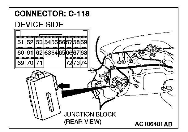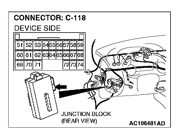 STEP 2. Check ETACS-ECU connector C-118 and powertrain control module connector C-57 <2.4 L ENGINE> or C-59 <3.0 L ENGINE> for loose, corroded or damaged terminals, or terminals pushed back in the connector.