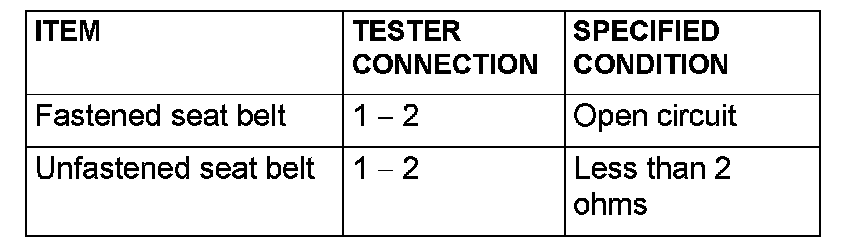 Disconnect driver's seat belt switch connector D-13.Then check continuity between the switch terminals.