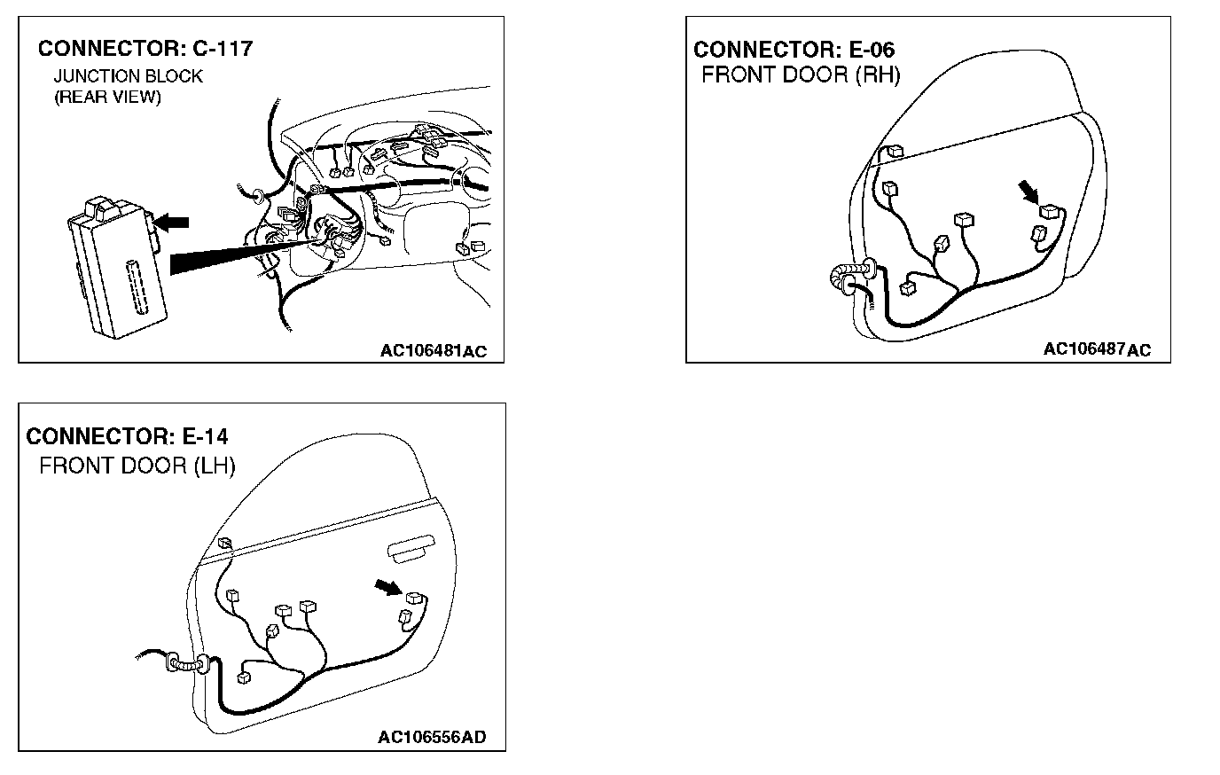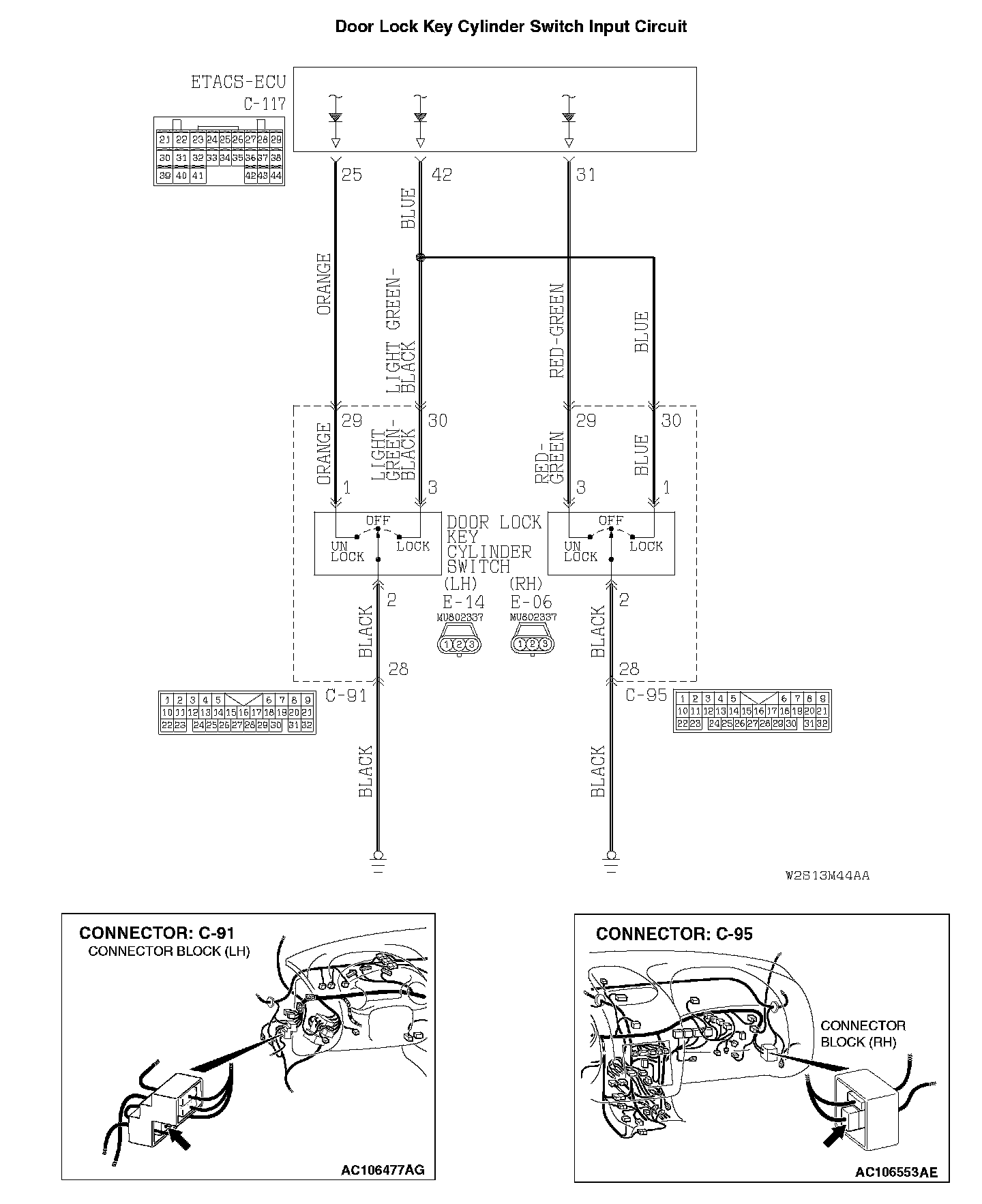 STEP 13. Check the wiring harness between front passenger's door lock key cylinder switch connector E-06 (terminals 1 and 3) and ETACS-ECU connector C-117 (terminals 42 and 31).