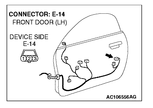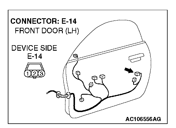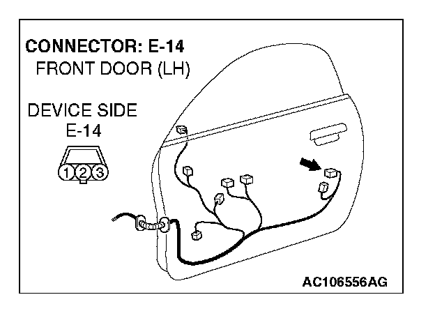1. Disconnect driver's door lock key cylinder switch connector E-14 and measure the resistance available at the wiring harness side of the connector.